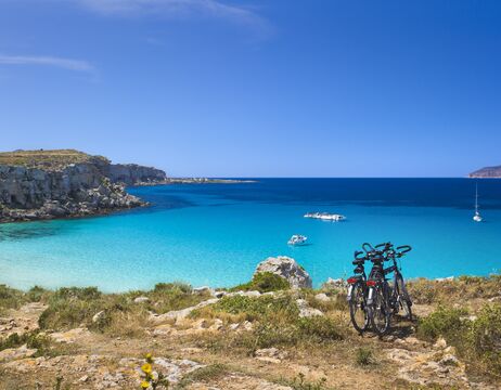 Besichtigung der durch Odysseus bekannten Ortschaft Aci Trezza, die heute ein Meer-Naturschutzgebiet ist. Diese Etappe führt Sie entlang der ionischen Küste, vorbei an langen Stränden, Zitrushainen und den malerischen Fischerdörfern Pazzillo und Stazzo. Sie radeln bis Acireale wo Sie das barocke Stadtzentrum besichtigen. Weiter mit dem Bus nach Acitrezza. Bekannt ist der Ort durch Odysseus. Der Zyklop hat hier Felsen auf den Seefahrer geschleudert, die sogenannten „Faraglioni“. Mit dem Bus geht es nach Catania in das bunte, quirlige Stadtzentrum. Retour mit dem Bus zum Hotel. (Strecke: 35 km, Schwierigkeitsgrad: einfach, Höhenunterschied: 350 m)